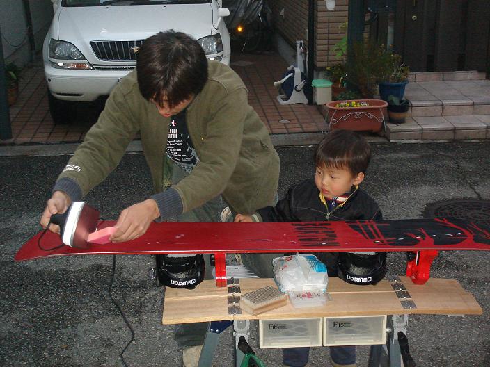 いよいよ冬が近づいてきました。ボードのメンテナンス レオもお手伝い。 |