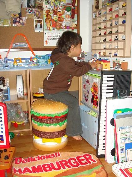 | 1.26.2008 | レオの部屋は、こんな感じです。 奥にあるのがトミカ自動車工場。そのまわりに トミカタウン(ネッツトヨタ、セブンイレブン、ミスドetc..) 右上が Made by Ken-Z のトミカラック。 その横が レオ専用キーボード。 レオが座っているのは巨大ハンバーガー型 椅子。 |