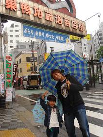 | 途中、巣鴨の標識を見つけ。 きっと電車や飛行機の旅なら ここに来る事はないだろう と思い、ハンドルは巣鴨方面に。 あいにくの雨の為、人通りは 少なかったけど、 何となく巣鴨な雰囲気を味わう ことが出来た。 |