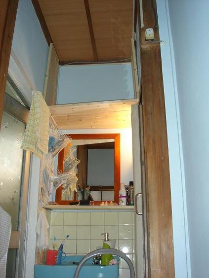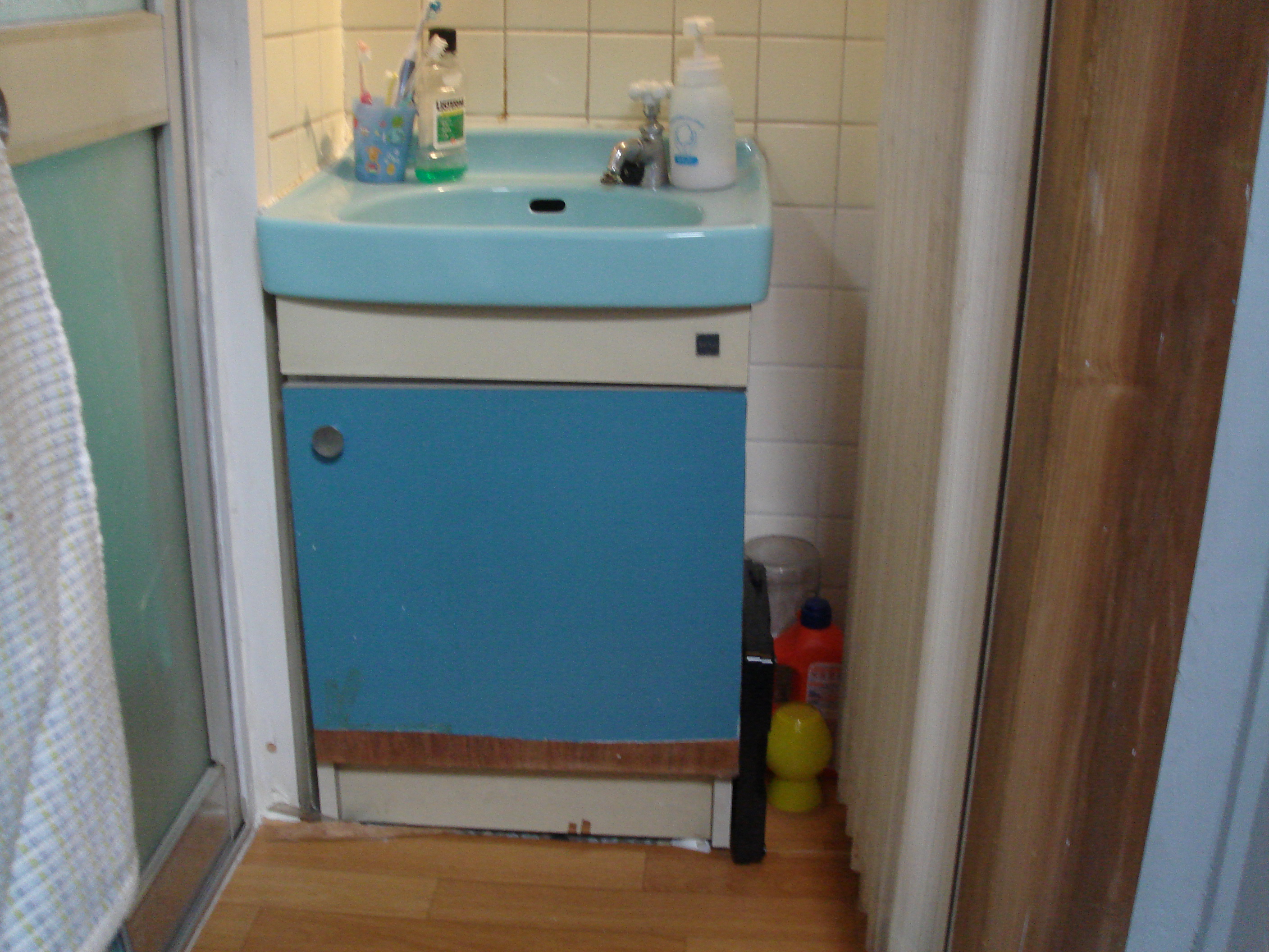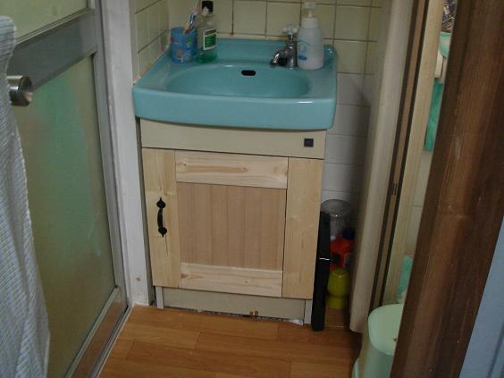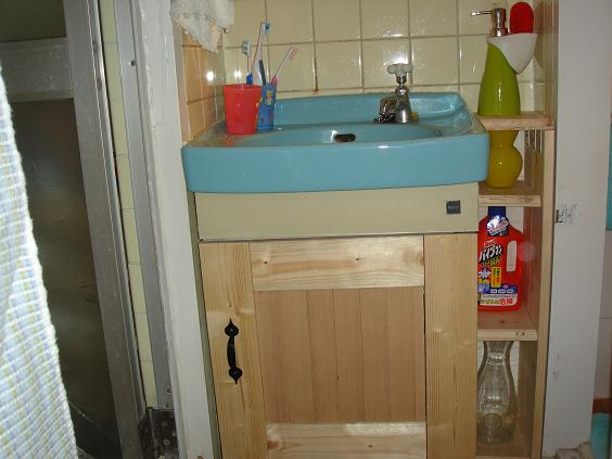 | 古くなって下の方 も板がはげてきている 年期の入った洗面台。新しい洗面台の購入も考えたけど、自分で作った方がかっこいいし、安上がり。 |