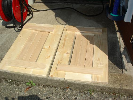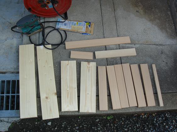 近所のホームセンターで板を購入。 それぞれパーツごとに丸のこでカット。 サンドペーパーがけもします。 |