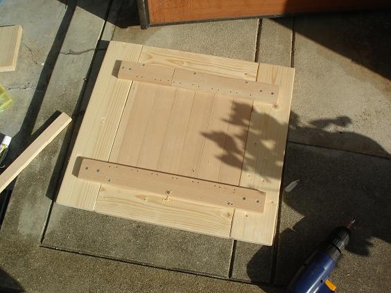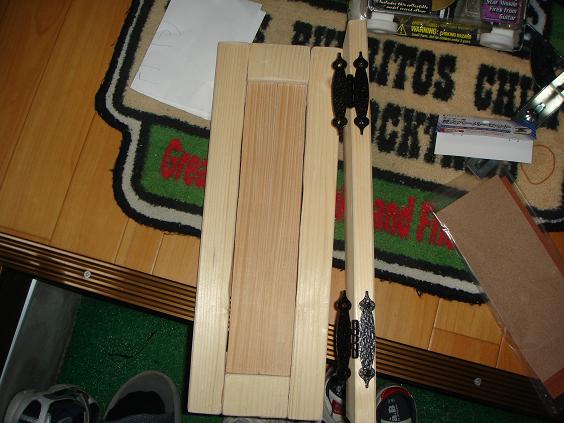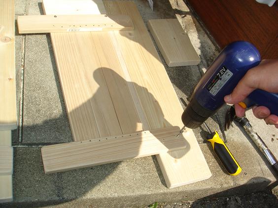 | 電動ドライバーで組み立て。 | カントリー風、蝶番を 取り付け。 いい感じになってきました。 |