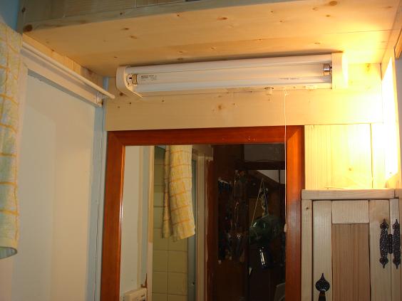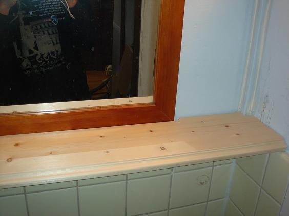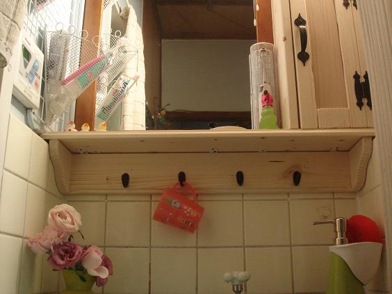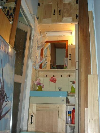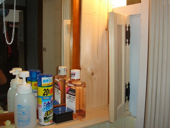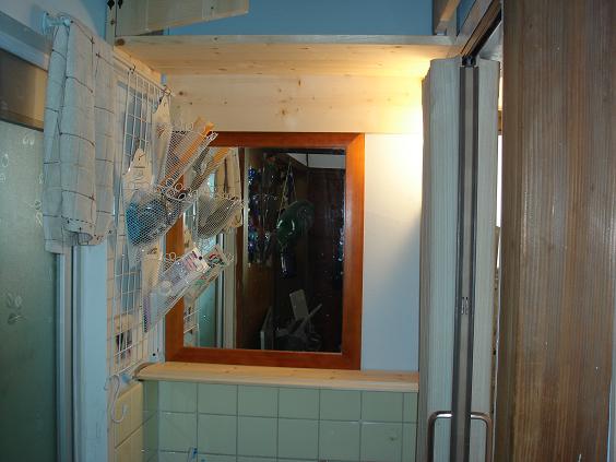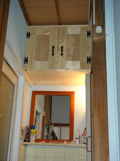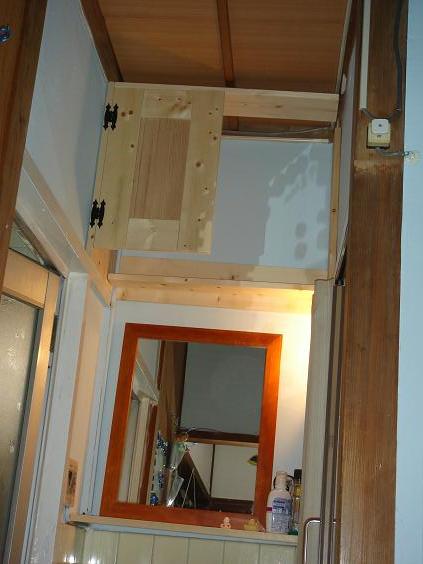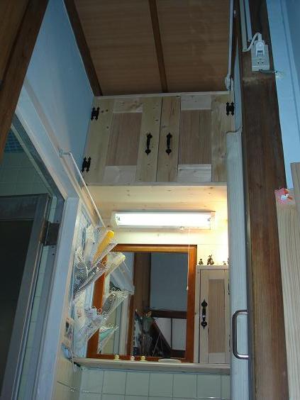 | 洗面台上部 を作成。 家の壁がゆがんでいる せいか、サイズを測って カットした板もなかなか 合わない、、、。 |