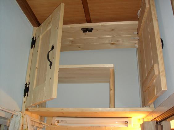 | L字金具を使用し 上下左右の板を取り付け。扉の取っ手もアンティーク 使用のものを取り付け。 そして上部完成!。 |